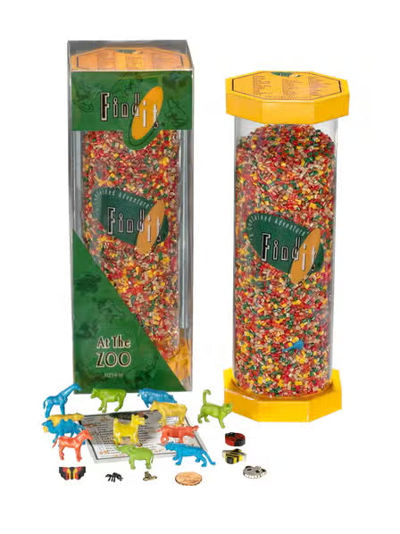 Find It " at The Zoo" has 40 items to find and has bright yellow ends. The vivid variety of plastic pellets compliment the animals within Animal lovers will have fun looking for a mixture if reptiles, fish, mammals , birds and bugs , along with the hidden penny . A list of of items is on top of the sealed contained adventure . A check off pad is also included. All Find It Games are proudly assembled in the USA