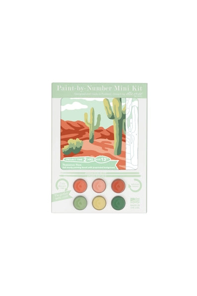 The perfect travel activity! Sonoran Sun mini paint-by-number kit (6x6 painting board) depicts a trio of cacti in an arid southwestern desert. The preprinted background sets this scene against a pale blue cloudy sky. Recommended for age 13+ Paint-by-number mini kits have our shortest project time (only 2 hours), which makes them the perfect project for an event or group activity! Like our kids kits your painting surface is made from sturdy and smooth 100% paper board so they’re easy to paint anywhere.