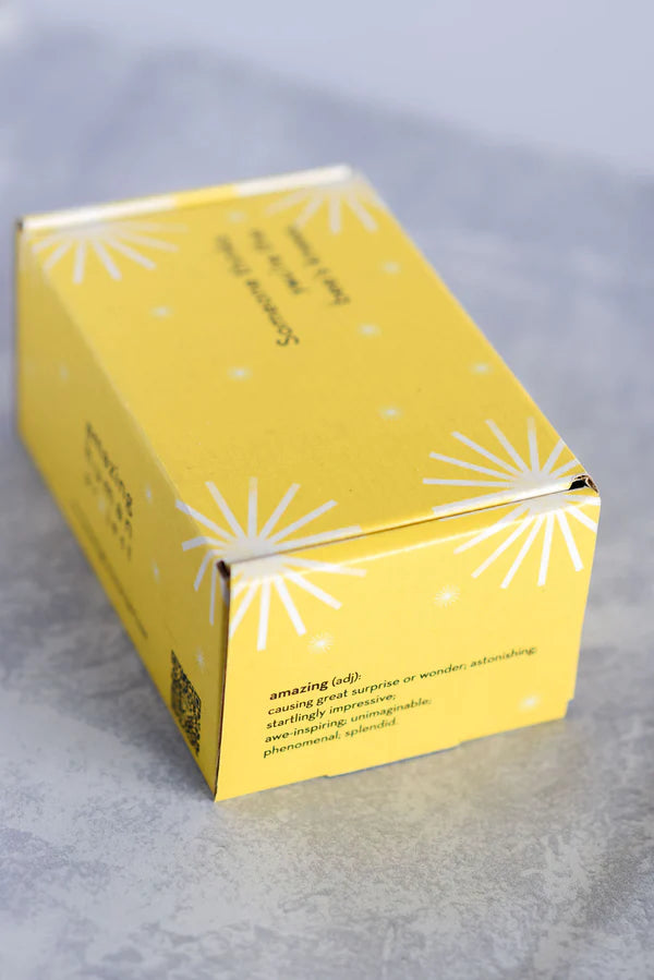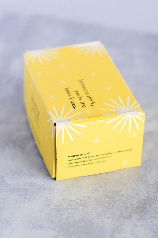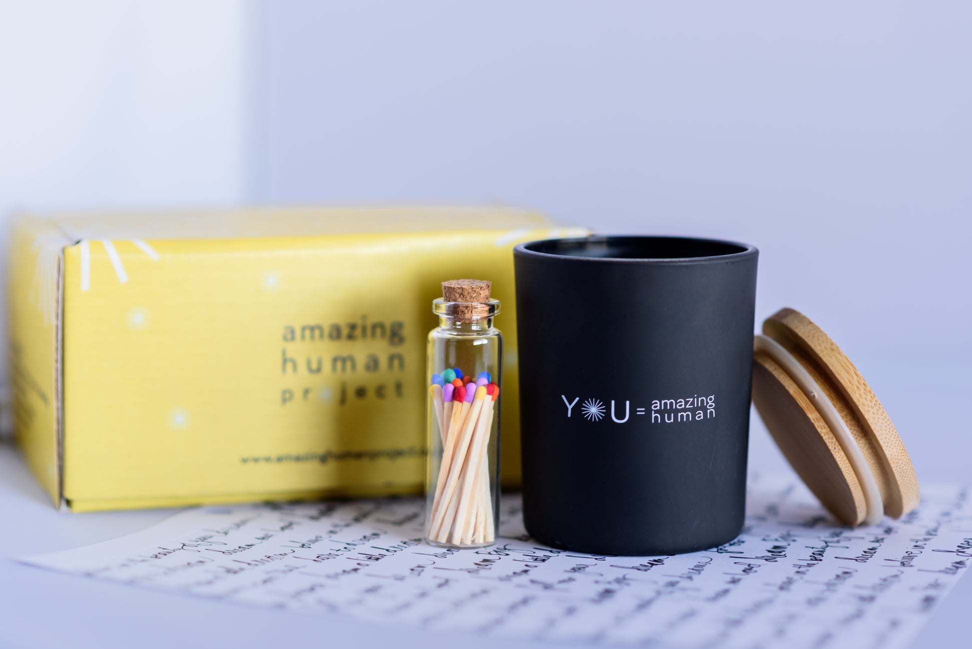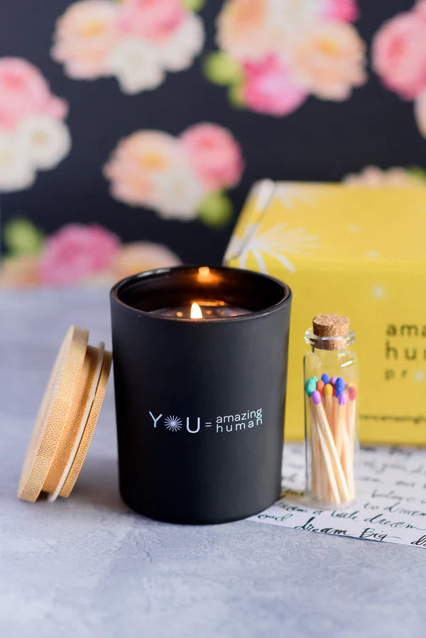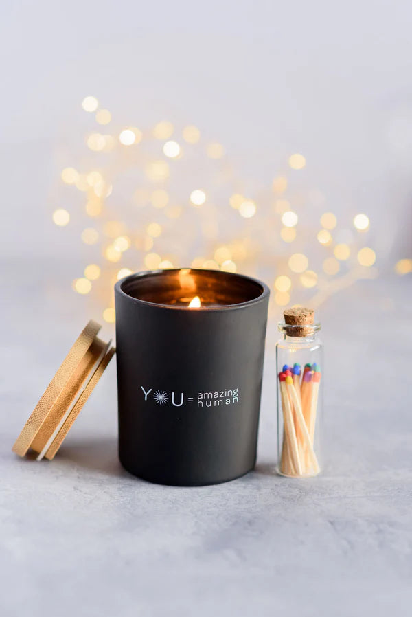 Whether it's to express gratitude, encouragement, celebration, or a simple reminder, we all enjoy brightening someone's day. Brighten someone's day by surprising a friend or colleague with our gorgeous black vanilla-scented candle with the uplifting message "YOU = amazing human". The candle is topped with a sleek bamboo lid and paired with a delightful glass vial filled with 20 vibrant matches, complete with a cork top and a handy strike pad on the bottom.