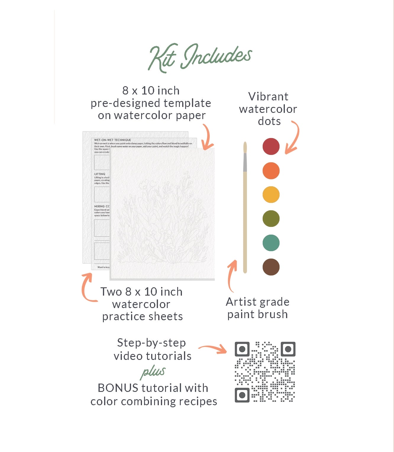 Unplug and get creative with our All-in-One Beginner Watercolor Kit! Designed for ease and enjoyment, this set includes everything you need to start painting—no experience required. Begin with the practice guide to build confidence, then bring your unique vision to life on the 8x10” design. Our beginner-friendly approach lets you explore colors freely, with no pressure to follow the example image. Perfect for relaxation and self-expression, this kit makes watercolor accessible and fun. Each kit includes: