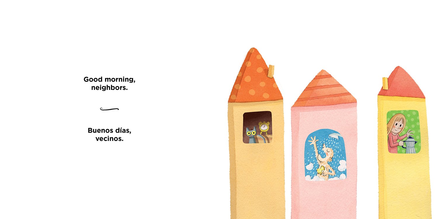 Cleverly introduce basic ideas about what happens in the morning when you wake up, including a rooster crowing, an alarm clock ringing, Dad shaving, and neighbors making coffee. The tabs add fun and unexpected movement for illustrator Xavier Salomó’s simple but engaging art.