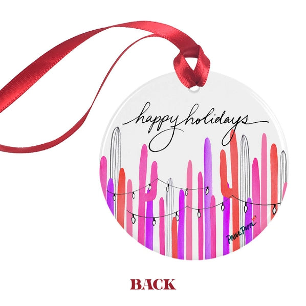 Trim your tree with a work of art! My "Pink Saguaro Light" Porcelain Ornament brightens your home with desert magic. Handpainted in watercolor by Artist, Paige Poppe this cheerful scene of pink-hued saguaro cacti trimmed with holiday lights is captured on this Ornament. Paired with coordinating "happy holidays" message to bright festive delight. Packaged beautifully in an elegant box adorned with coordinating art labels, the "Pink Saguaro Lights" Ornament is not just a fun addition to your holiday collection, but the perfect gift for loved ones who appreciate the beauty of handcrafted art.