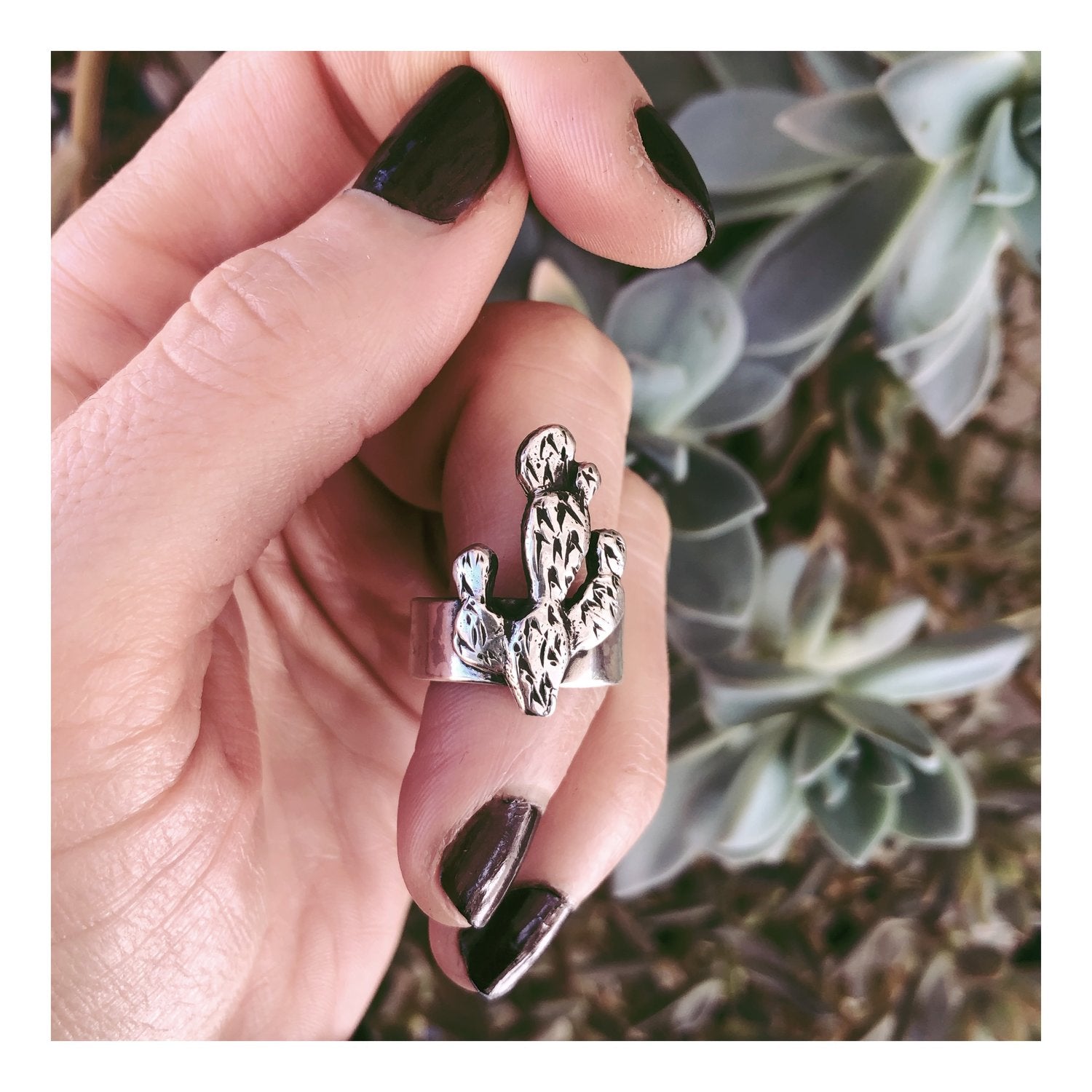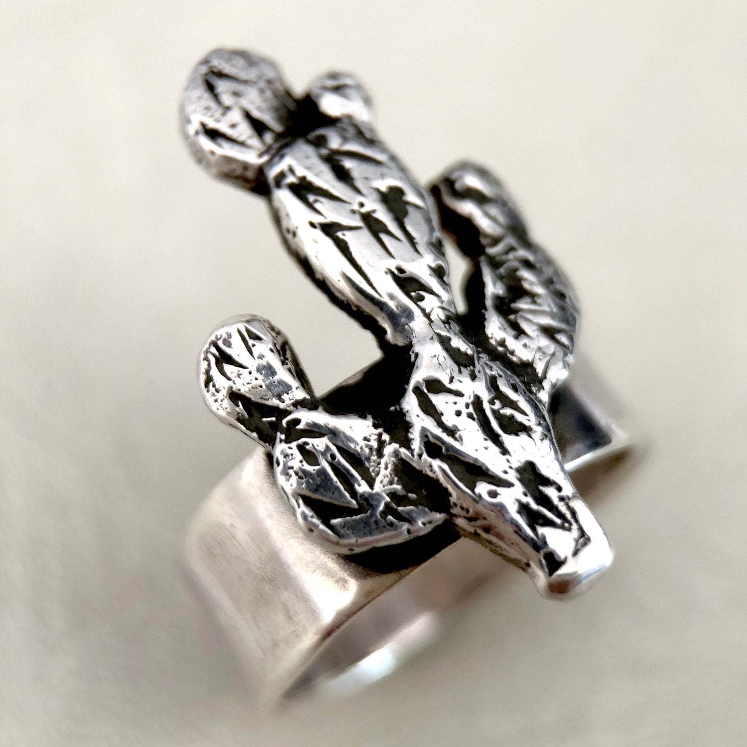 Prickly pear ring in solid sterling silver. Cast cactus on a hand hammered band.