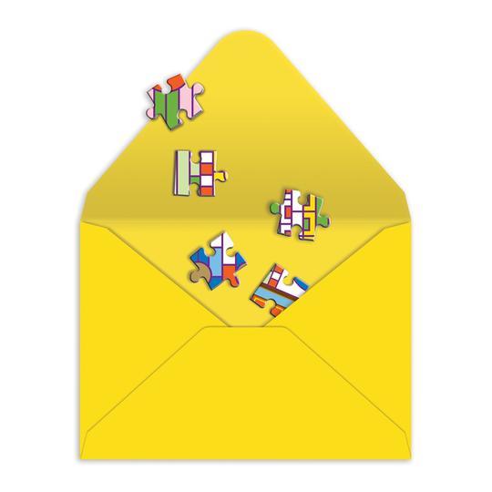 The Frank Lloyd Wright Saguaro Forms & Cactus Flowers Greeting Card Puzzle from Galison is a 60-piece postcard puzzle featuring Wright's colorful and iconic geometric design. The package comes with the puzzle fully assembled. Write the message on the back, break up the pieces, place in the envelope, and mail.