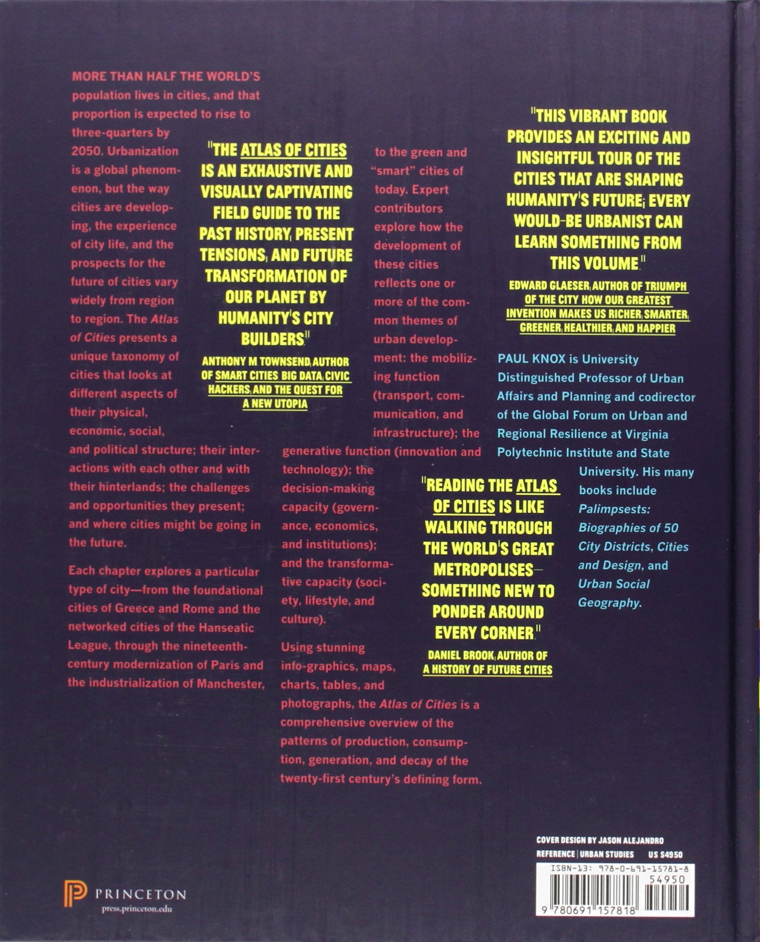 More than half the world's population lives in cities, and that proportion is expected to rise to three-quarters by 2050. Urbanization is a global phenomenon, but the way cities are developing, the experience of city life, and the prospects for the future of cities vary widely from region to region. The Atlas of Cities presents a unique taxonomy of cities that looks at different aspects of their physical, economic, social, and political structures; their interactions with each other and with their hinterlands; the challenges and opportunities they present; and where cities might be going in the future.