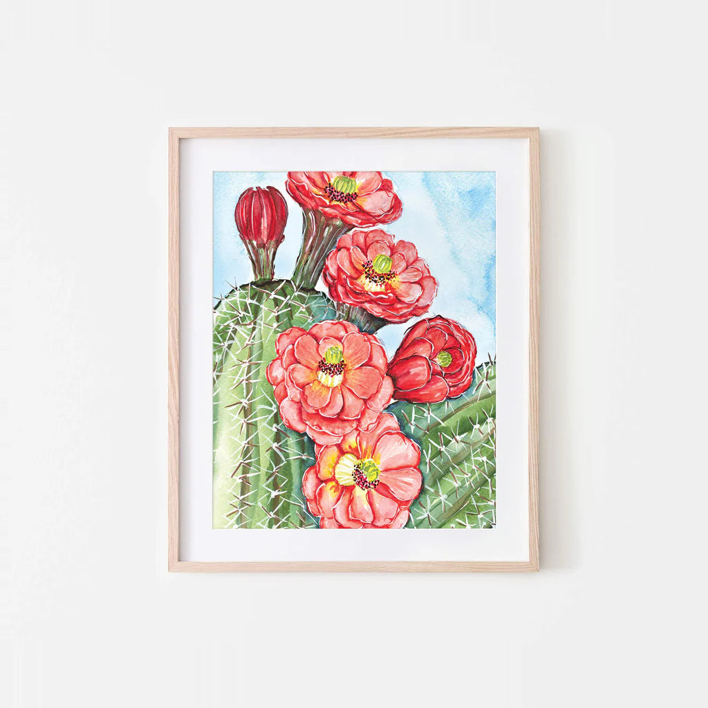 This vibrant print features a beautiful red claret cup cactus in full bloom. This print was created from an original watercolor painting by Melissa Balkon.