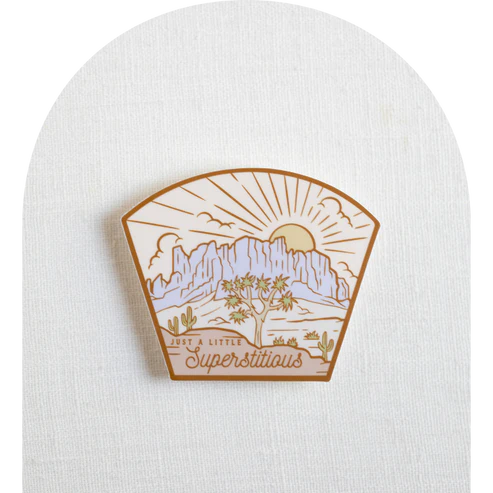 This sticker was created for fellow Superstition lovers and is 3 inches on the long side. Stickers are printed on high quality outdoor grade vinyl and laminated adding durability, scratch protection, and UV protection. Water proof and weatherproof, you can put these on your laptop, car, water bottle, bicycle, etc!